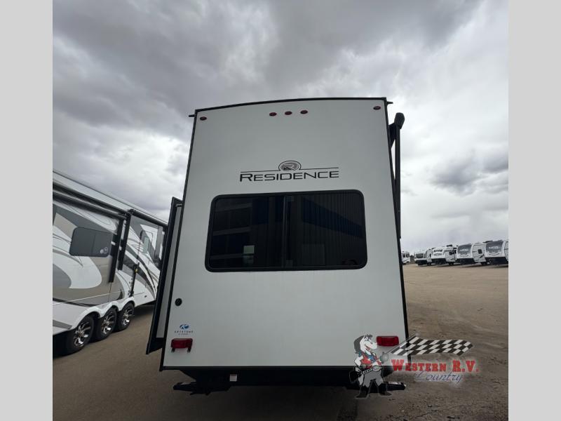 This RV is engineered to accommodate up to eight people comfortably, making it perfect for family adventures or group getaways. The intelligently designed interior includes a master bedroom, a cozy living area, and a fully equipped kitchen, all crafted with high-quality materials and finishes. The Residence 401FSRL boasts a robust build, weighing approximately 5,891 kilograms, ensuring stability and durability for all your travels. Despite its substantial size, this RV maintains a sleek and modern aesthetic, both inside and out.