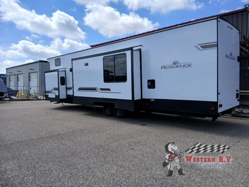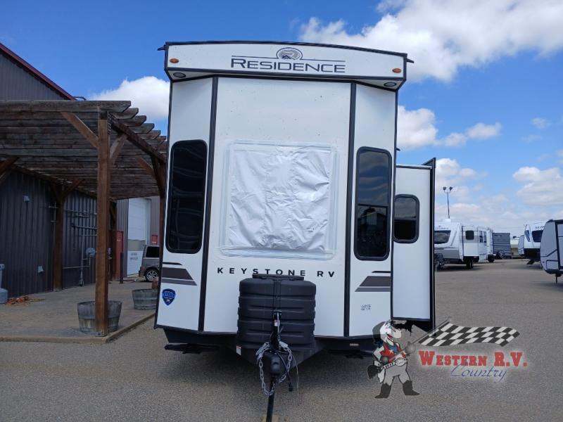 Weighing in at approximately 5,848 kilograms, the Keystone Residence 401HBDL is built for stability and durability. Its thoughtful design includes a well-appointed interior with modern amenities to enhance your travel experience. The RV features a fully equipped kitchen with high-quality appliances, a comfortable living area, and a luxurious bathroom, providing all the comforts of home while on the road. The sleeping arrangements are versatile, with a master bedroom, bunk beds, and convertible sleeping spaces to suit your needs.