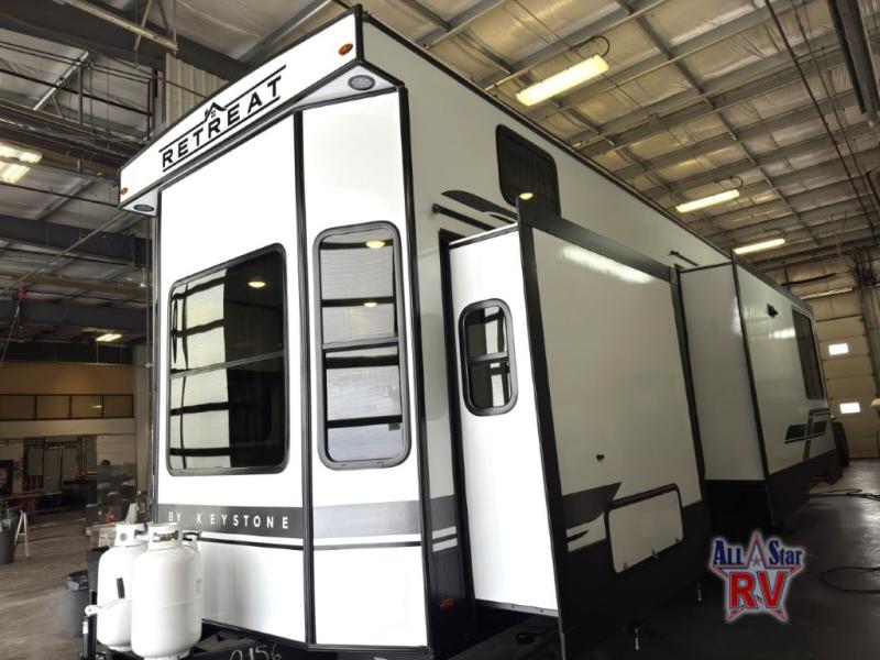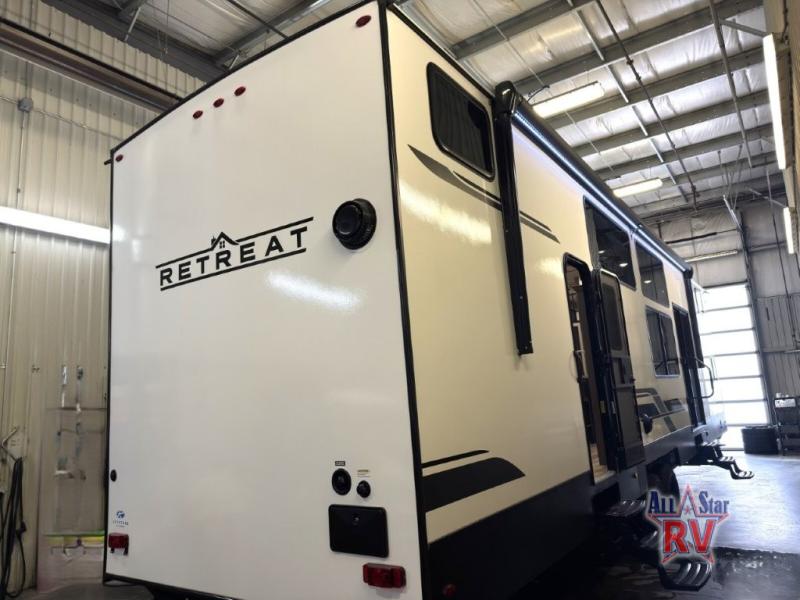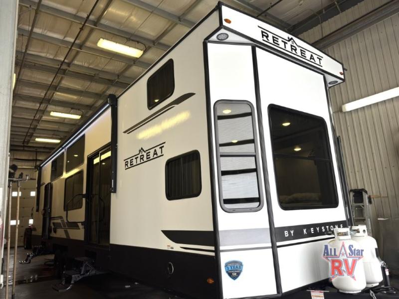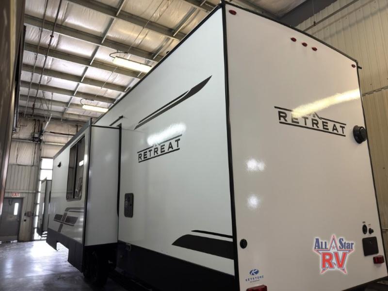 Introducing the 2025 Keystone RV Retreat 391HBDL Park Model, your ultimate home away from home. This spacious RV is designed for comfort and convenience, featuring two slide-outs that expand your living space, making it perfect for family vacations or extended stays. With a length of 35 feet, this model offers ample room for relaxation and entertainment, ensuring everyone has their own space to unwind.