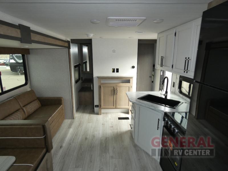 With a single slide-out, this RV maximizes interior space, providing a roomy living area that can sleep up to eight people. The well-thought-out floor plan includes a cozy master bedroom, double-over-double bunk beds, and a convertible dinette and sofa, making it ideal for family trips or group outings. The interior is equipped with modern amenities, including a fully functional kitchen with a refrigerator, microwave, and stove, ensuring you have everything you need for a home-cooked meal on the road.