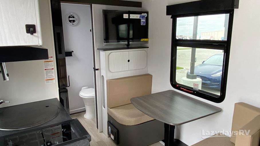 The interior of the Keystone Sprout 15RBS is thoughtfully crafted to maximize comfort and convenience. Featuring one slide-out, this travel trailer expands to provide ample living space, ensuring a comfortable stay for up to three occupants. The well-appointed sleeping area, combined with a cleverly designed dinette that converts into an additional sleeping space, ensures restful nights after a day of exploration. The kitchen is equipped with essential amenities, including a refrigerator, microwave, and stove, allowing you to prepare meals with ease while on the road.