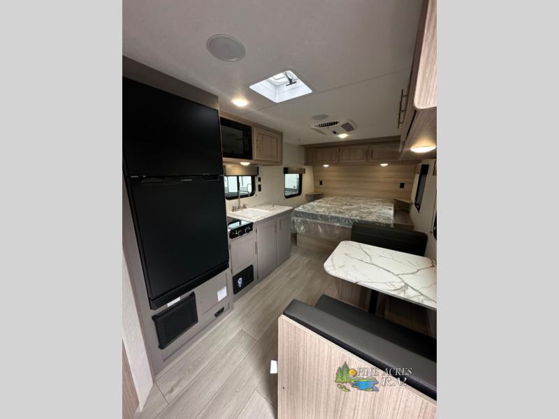Inside, the KZ Sportsmen Classic 160QB offers a cozy retreat that can comfortably sleep up to three people. The intelligently designed layout maximizes space, featuring a comfortable queen-sized bed and a convertible dinette that easily transforms into an additional sleeping area. The interior is thoughtfully equipped with modern amenities, including a fully functional kitchenette with a two-burner stove, microwave, and refrigerator, allowing you to prepare meals with ease. The well-appointed bathroom includes a shower and toilet, providing all the essentials for a comfortable stay.