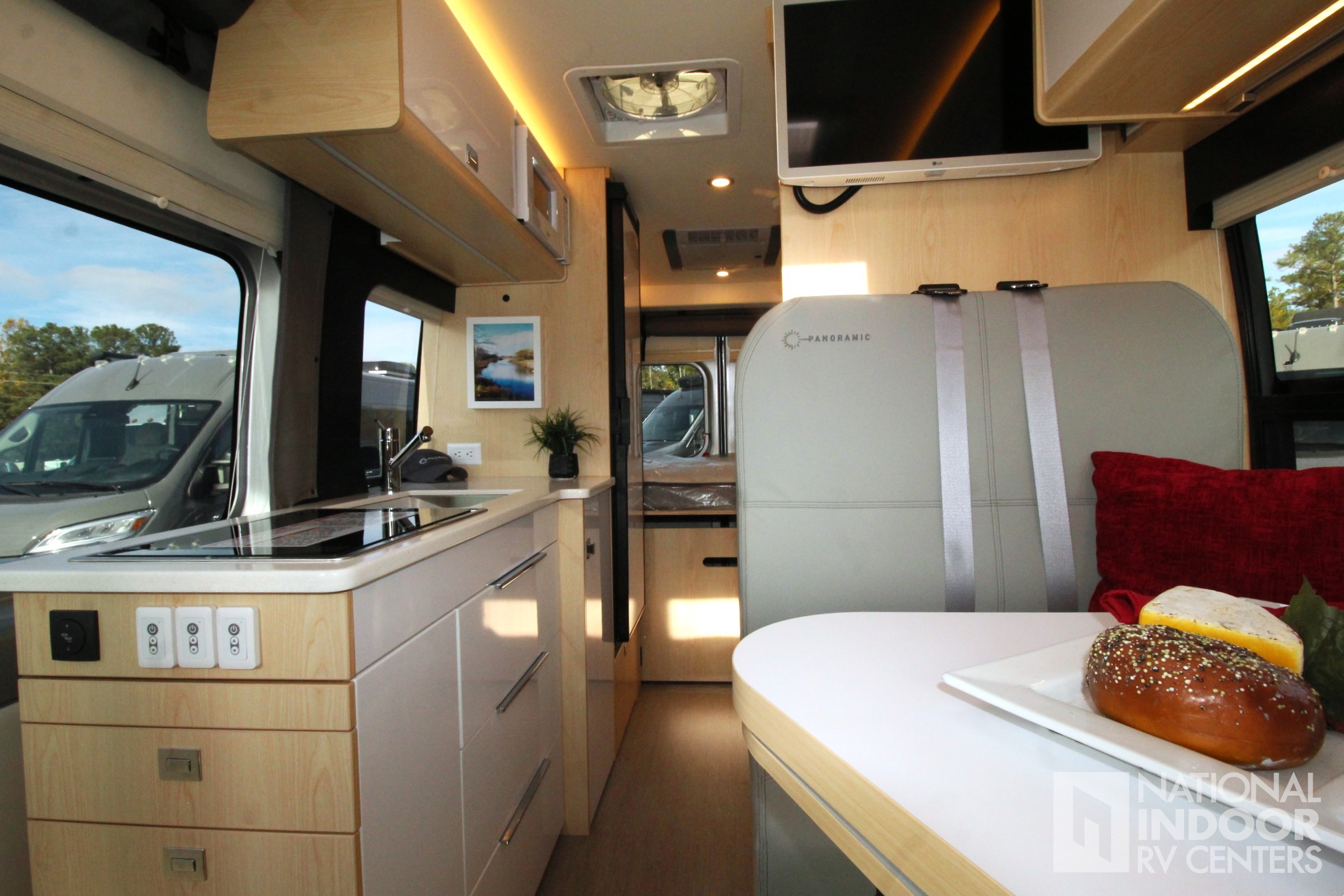 Step inside to find a thoughtfully designed interior that maximizes space and functionality. The Panoramic RV features a fully equipped kitchenette with a refrigerator, stove, and microwave, allowing you to prepare meals on the go. The cozy sleeping area comfortably accommodates two, ensuring restful nights after a day of exploration. Ample storage solutions are integrated throughout, providing space for all your travel essentials. The modern bathroom includes a shower, sink, and toilet, offering convenience and privacy wherever your travels take you.