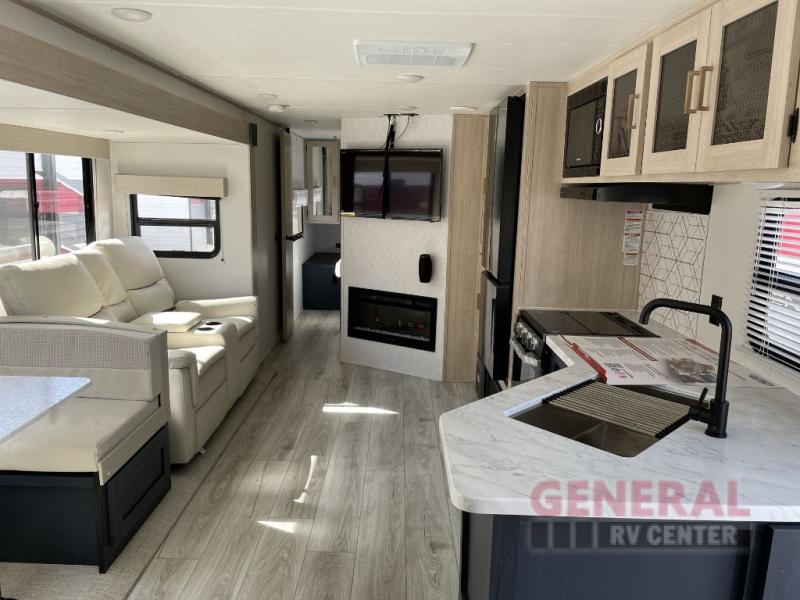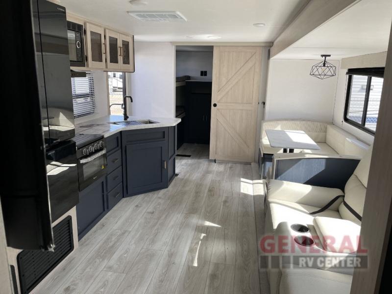 The Avenger 29QBS features one slide-out, which significantly enhances the living area, providing a spacious and inviting environment. The intelligently designed floor plan includes a well-appointed kitchen, complete with modern appliances, and a cozy dining area, perfect for family meals or entertaining guests. The sleeping arrangements are thoughtfully configured to ensure privacy and comfort, with a master bedroom, bunk beds, and convertible sleeping spaces to accommodate all your travel companions.