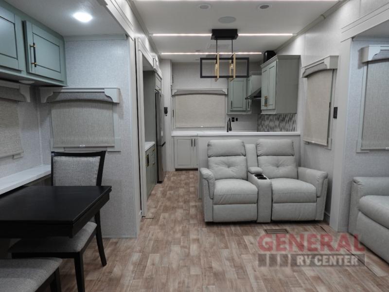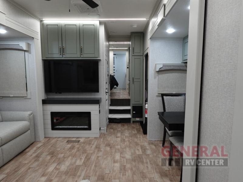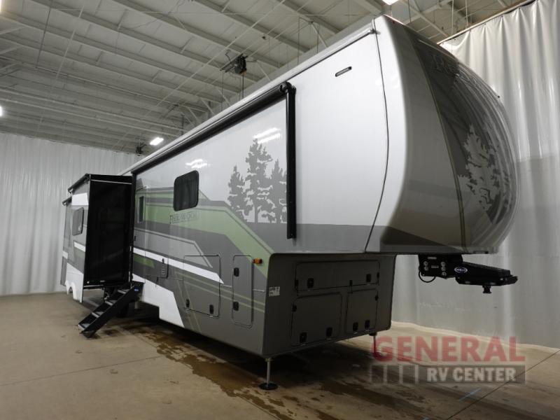 This fifth wheel is designed to comfortably sleep up to four people, making it ideal for families or couples seeking a premium travel experience. The thoughtfully designed interior includes a well-appointed kitchen, a cozy living area, and a luxurious master suite, ensuring that every journey is as comfortable as it is memorable. High-quality finishes and modern amenities throughout the RV enhance the overall experience, offering a true home-away-from-home feel.
