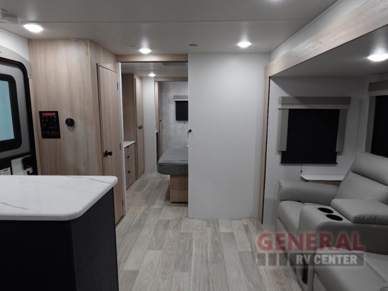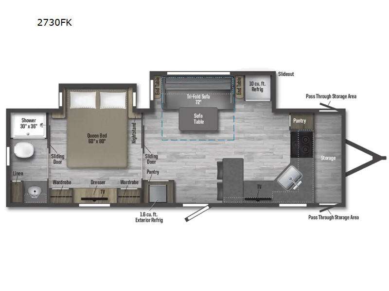 The Minnie 2730FK is thoughtfully designed to accommodate two people, making it an ideal choice for couples or solo adventurers who appreciate a touch of elegance on the road. The interior is enhanced by two slide-outs, which significantly expand the living space, providing an open and airy atmosphere. The well-appointed kitchen, located at the front, is equipped with modern appliances and ample storage, ensuring that meal preparation is both convenient and enjoyable. The living area is designed for relaxation, featuring comfortable seating and state-of-the-art entertainment options.