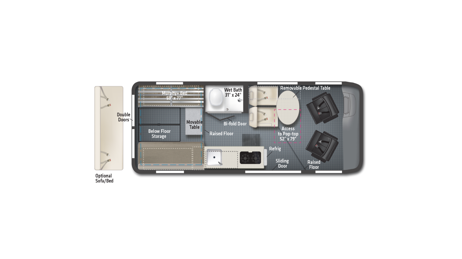 Step inside and be greeted by a thoughtfully designed interior that maximizes every square meter. The Solis 59P features a versatile layout with a fully equipped kitchen, complete with a two-burner stove, sink, and refrigerator, allowing you to prepare meals on the go. The cozy sleeping area comfortably accommodates two, ensuring restful nights under the stars. With ample storage throughout, you can bring along all your essentials without feeling cramped. The RV also includes a wet bath with a shower and toilet, providing the convenience of home wherever you roam.