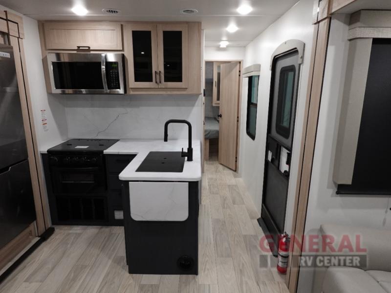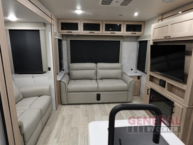 Inside, the Voyage 2730RL comfortably sleeps up to four people, making it perfect for family getaways or a cozy retreat for couples. The intelligently designed floor plan includes a luxurious master bedroom and a convertible living area, ensuring everyone has their own space to unwind. The interior is equipped with high-quality finishes and state-of-the-art appliances, offering all the comforts of home while on the road.