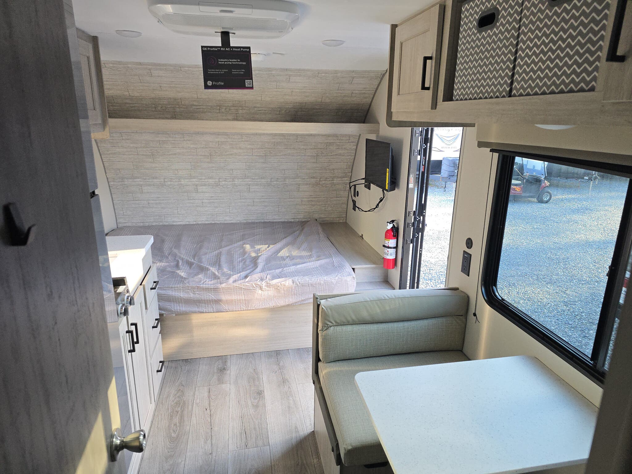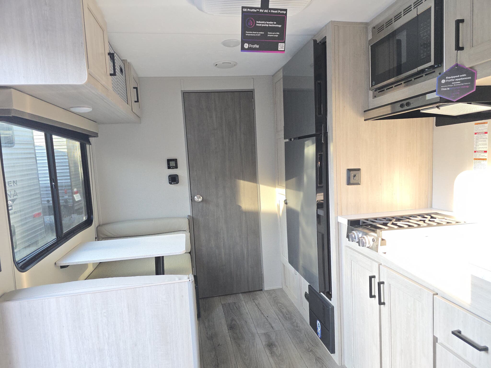 Inside, the Catalina Summit Series 7 154RBX offers a welcoming retreat for two, making it perfect for couples or solo travelers seeking a peaceful escape. The thoughtfully designed interior maximizes space and functionality, featuring a comfortable sleeping area, a compact yet fully equipped kitchenette, and a cozy dining nook. Whether you're preparing a meal or enjoying a quiet evening indoors, this travel trailer provides all the essentials for a comfortable stay.