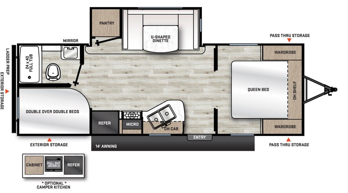 Step inside to find a thoughtfully designed interior that can comfortably sleep up to five people. The clever layout includes a cozy bunkhouse, a convertible dinette, and a comfortable queen bed, ensuring everyone has a restful night's sleep. The single slide-out expands the living area, providing extra room to relax and enjoy your time indoors. The modern kitchen is equipped with all the essentials, including a refrigerator, microwave, and stovetop, making meal preparation a breeze.
