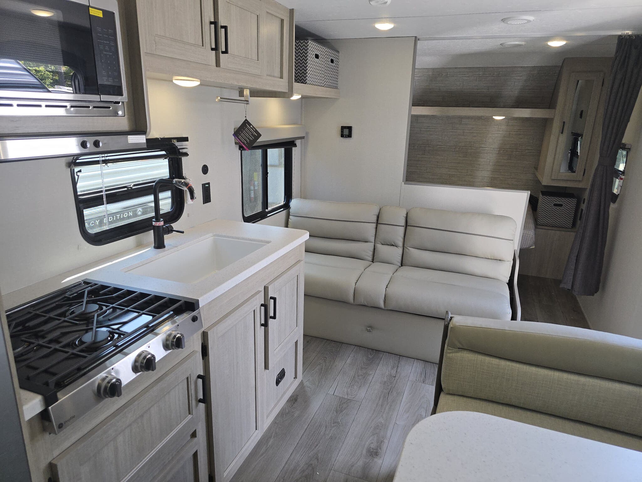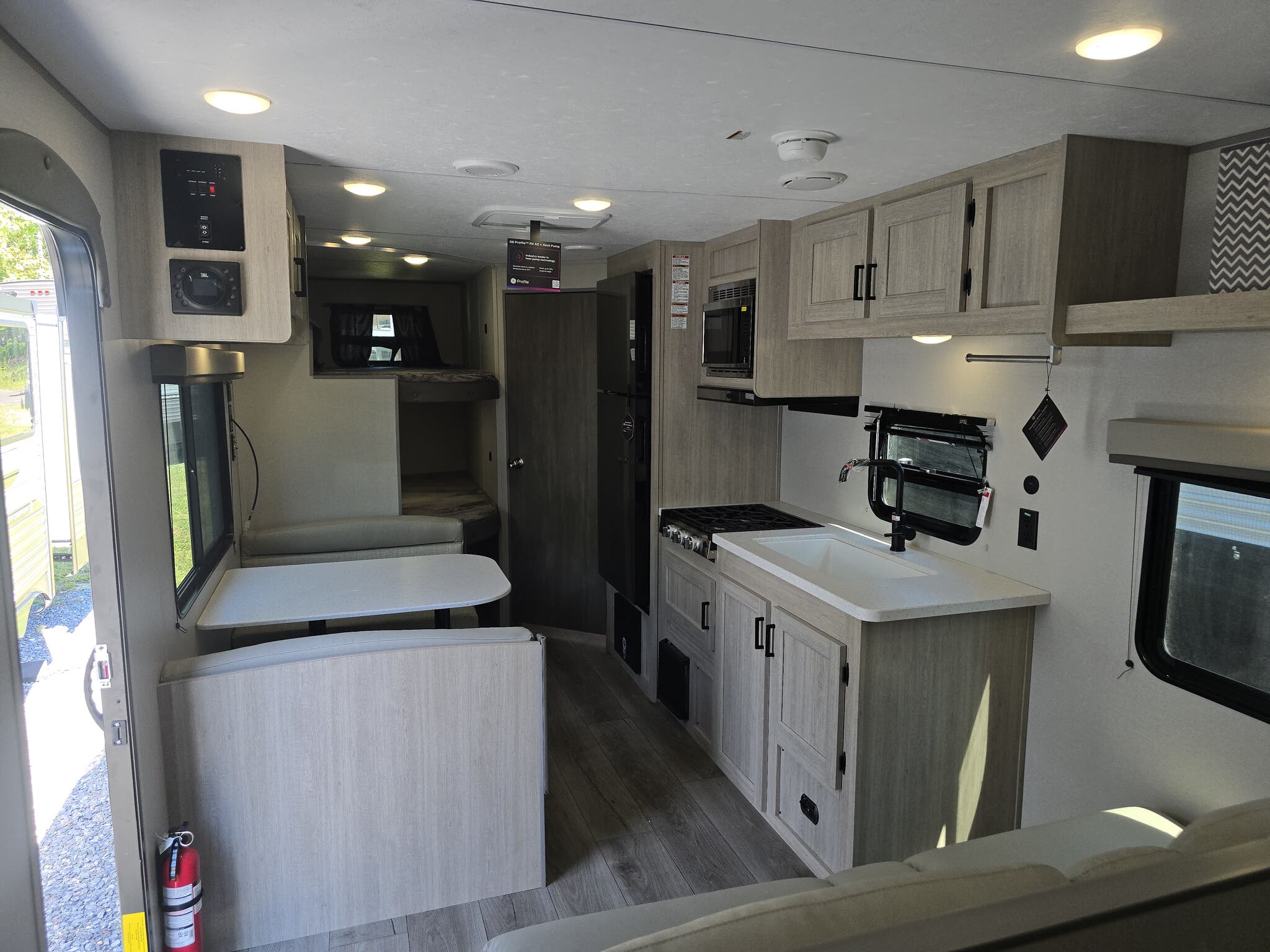 Step inside and experience the thoughtfully designed interior that comfortably sleeps up to nine people. Whether you're planning a weekend getaway or an extended road trip, this travel trailer ensures everyone has a cozy place to rest. The intelligently laid-out floor plan includes a spacious living area, a fully-equipped kitchen, and a modern bathroom, ensuring all the comforts of home are at your fingertips. With its sleek design and high-quality finishes, the Coachmen Catalina Summit Series 8 is not just a travel trailer; it's a mobile sanctuary.