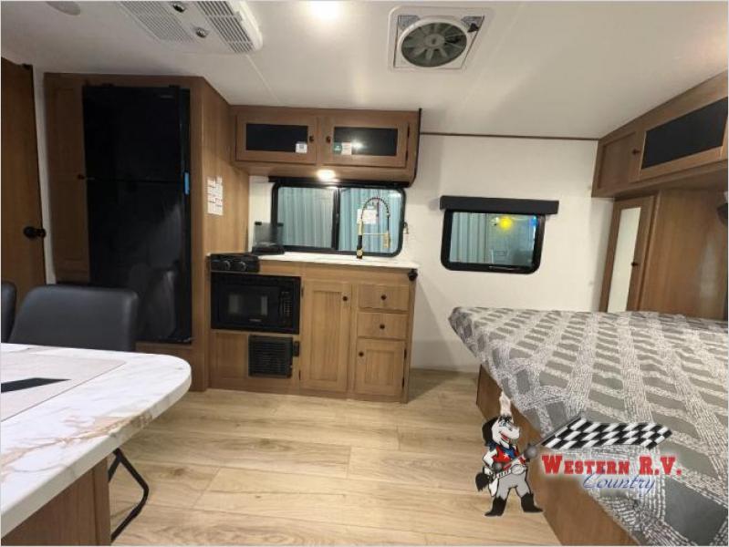 Step inside to discover a thoughtfully designed interior that maximizes space and convenience. The Apex Nano 181RB features a well-appointed living area with high-quality furnishings and finishes, ensuring a comfortable and inviting atmosphere. The kitchen is equipped with modern appliances, including a refrigerator, microwave, and a two-burner cooktop, providing all the essentials for preparing meals on the go. The spacious bathroom, complete with a shower and ample storage, adds to the convenience, making this travel trailer a true home away from home.