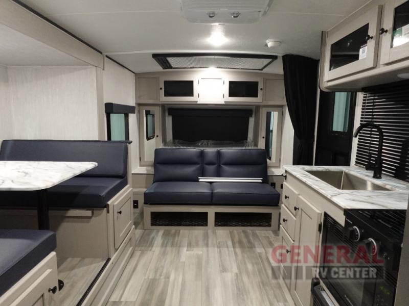 The Apex Nano 208BHS features a well-thought-out floor plan with one slide-out, maximizing interior space to ensure a comfortable living experience. It can sleep up to seven people, making it ideal for family trips or group outings. The intelligently designed sleeping arrangements include a cozy queen-sized bed, bunk beds, and a convertible dinette, ensuring everyone has a restful night's sleep. The interior is equipped with modern amenities, including a fully functional kitchen with a refrigerator, microwave, and stovetop, allowing you to prepare meals with ease.