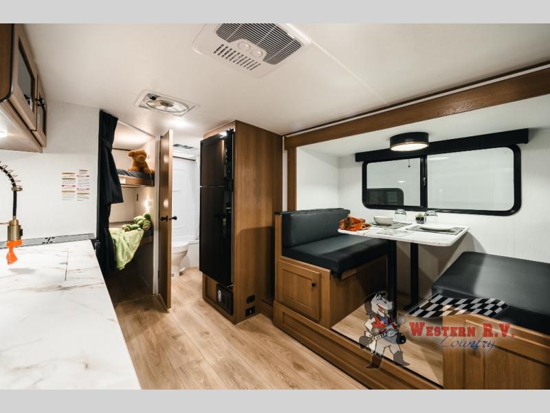 Inside, the Apex Nano 228BHS features a smart layout with one slide-out that expands your living space, providing a roomy and inviting atmosphere. It comfortably sleeps up to seven people, thanks to its well-appointed sleeping arrangements, including a cozy queen bed, bunk beds, and a convertible dinette. The interior is thoughtfully designed with high-quality materials and finishes, ensuring both durability and style. The kitchen is equipped with essential appliances, allowing you to prepare meals with ease, while the bathroom offers all the conveniences of home.