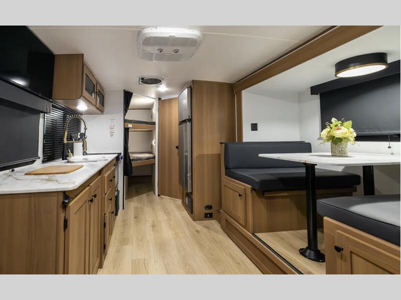Step inside and be greeted by a thoughtfully designed interior that maximizes every inch of space. The Apex Nano 228BHS features a modern, fully-equipped kitchen with all the amenities you need to prepare delicious meals on the go. The cozy dinette area is perfect for family meals or game nights, while the comfortable sleeping arrangements ensure a restful night's sleep for everyone. With its innovative bunkhouse design, this travel trailer can comfortably sleep up to six people, making it perfect for family adventures or trips with friends.