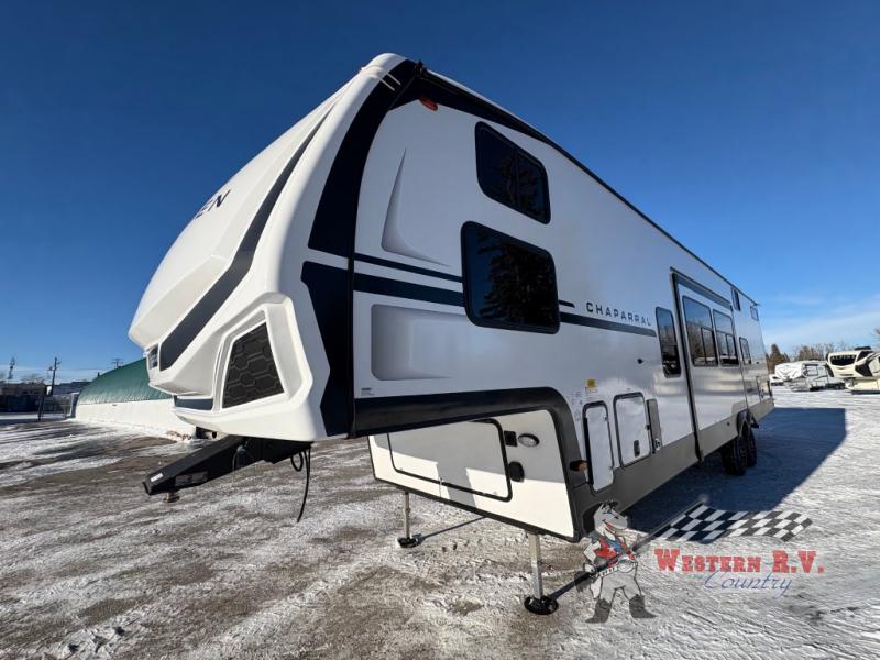 The Chaparral 375BAF boasts a sleeping capacity for up to eight individuals, ensuring that everyone can enjoy a restful night's sleep. The intelligently designed floor plan includes a master suite, bunk beds, and convertible sleeping areas, catering to diverse sleeping arrangements. Weighing approximately 5,639 kilograms, this fifth wheel is engineered for stability and ease of towing, providing peace of mind on your journeys. The RV's length, measured at an impressive 41 feet, offers a perfect balance of space and maneuverability, making it suitable for a variety of camping environments.