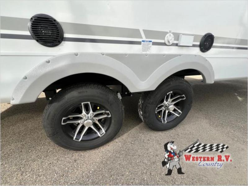 Inside, you'll find a thoughtfully designed space that comfortably sleeps up to three people. The inviting interior features a queen-sized bed and a convertible dinette, ensuring a restful night's sleep after a day of adventure. The kitchen is equipped with all the essentials, including a refrigerator, microwave, and a two-burner stove, all set within a smart layout that maximizes space. With ample storage throughout, you can bring along all your travel essentials and more.