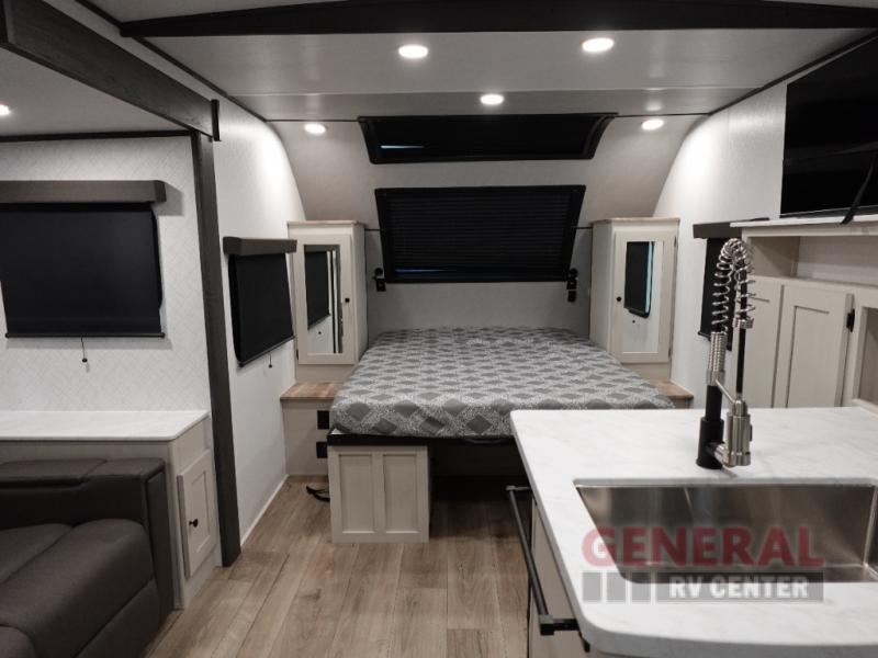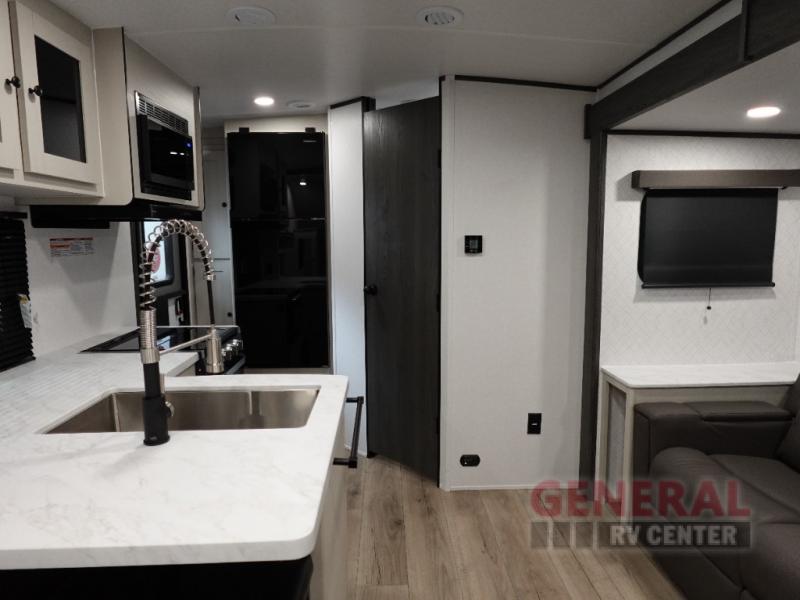 This travel trailer features one slide-out, which expands your living space to make room for all the comforts of home. Inside, you'll find a well-designed layout that can comfortably sleep up to three people. Whether you're traveling with family or friends, everyone will have their own space to relax and unwind. The interior is thoughtfully designed with modern amenities, ensuring you have everything you need for a comfortable stay, from a fully-equipped kitchen to a cozy sleeping area.