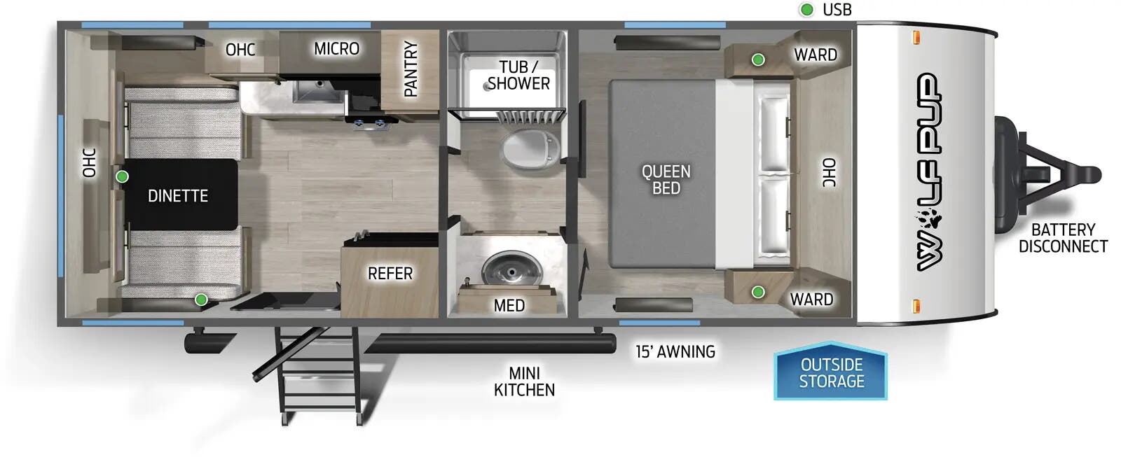 Weighing in at approximately 2,509 kilograms, the Wolf Pup 16CM is lightweight yet robust, ensuring a smooth towing experience without compromising on durability. Its smart design maximizes space and functionality, featuring a well-appointed interior that includes a comfortable sleeping area, a compact yet fully equipped kitchenette, and a stylish bathroom. The thoughtfully designed layout ensures that every inch of space is utilized efficiently, providing you with all the amenities you need for a comfortable journey.