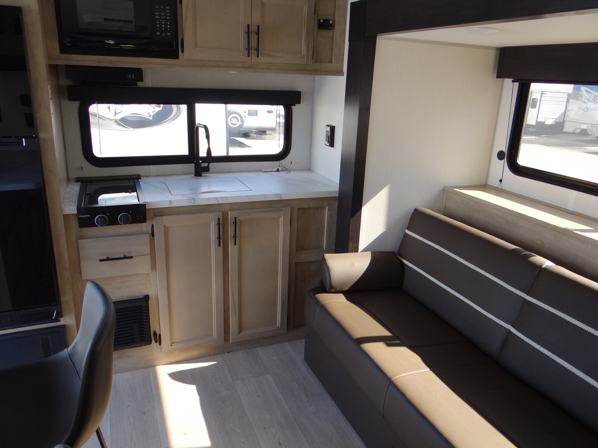 Inside, you'll find a cleverly designed space that comfortably sleeps up to three people. The standout feature is the versatile sofa/bed slide, which maximizes living space during the day and transforms into a cozy sleeping area at night. The rear kitchen is a dream for any travel chef, equipped with all the essentials to whip up your favorite meals on the go. Whether you're brewing your morning coffee or preparing a gourmet dinner, you'll have everything you need right at your fingertips.