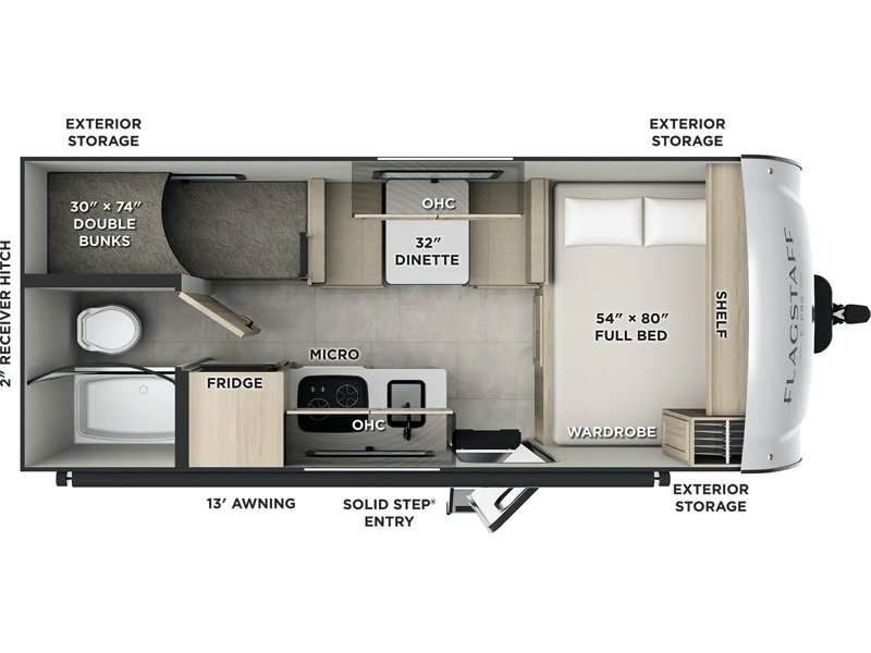 Step inside to discover a thoughtfully designed interior that maximizes space and functionality. The E17LE features a cozy sleeping area that comfortably accommodates up to three people, thanks to its convertible dinette and full-size bed. The kitchen is equipped with a two-burner cooktop, a microwave, and a refrigerator, allowing you to prepare meals with ease. Ample storage solutions, including overhead cabinets and under-bed compartments, ensure that all your essentials are neatly organized. The compact yet efficient bathroom includes a shower and toilet, providing all the comforts of home on the road.