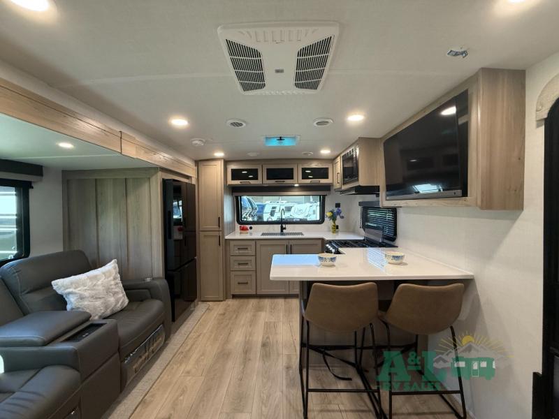 The 25MBR model features two slide-outs that significantly expand the interior space, providing ample room for relaxation and entertainment. Inside, you'll find a cozy sleeping area for two, ensuring restful nights after a day of exploration. The well-appointed kitchen includes all the essentials for meal preparation, while the stylish bathroom offers the privacy and convenience you need on the road.