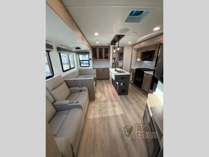 Inside, you'll find four slide-outs that create a roomy and comfortable living space, perfect for family trips or getaways with friends. This RV can sleep up to 10 people, so there's plenty of room for everyone to relax and unwind. The well-equipped kitchen, cozy dining area, and inviting lounge space make it feel just like home. Plus, the modern amenities and stylish finishes add a touch of luxury to your travels.