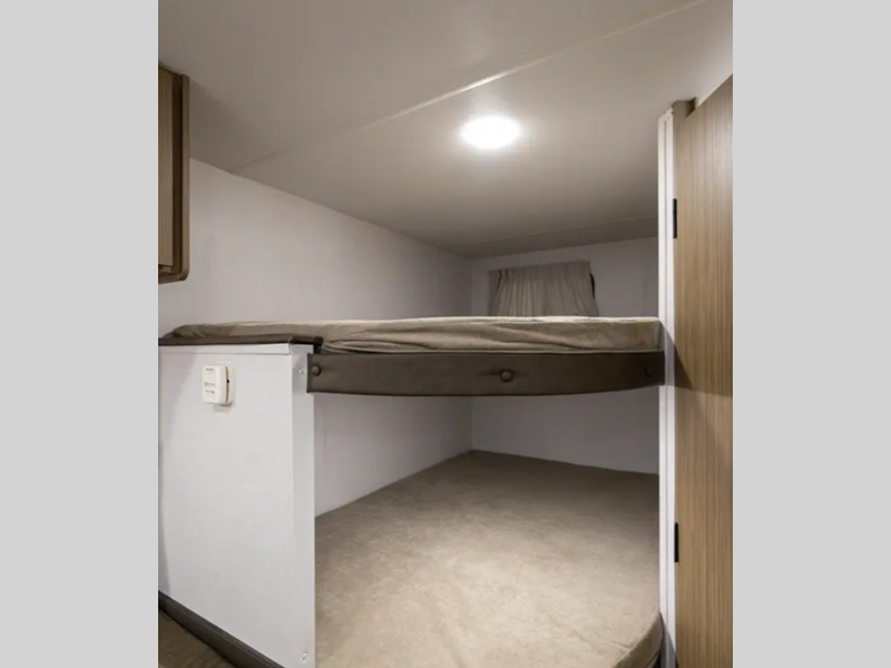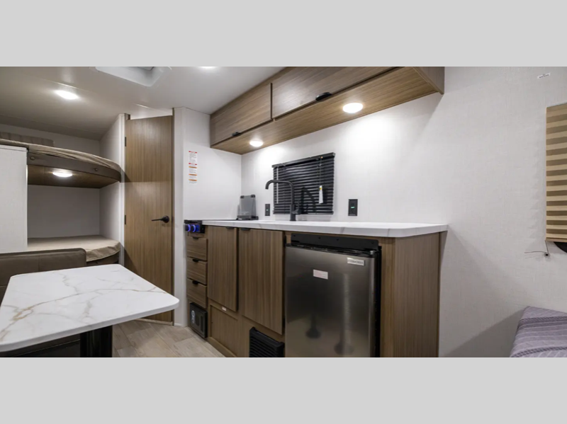 Weighing in at just 1,466 kilograms, this lightweight trailer is a breeze to hitch up and hit the road with. Despite its compact size, it’s packed with features to make your travels comfortable and convenient. Inside, you'll find a cozy sleeping arrangement that includes a double bed, bunk beds, and a convertible dinette, ensuring everyone has a comfy spot to rest after a day of adventure. The efficient layout maximizes space, providing ample storage for all your gear and essentials.