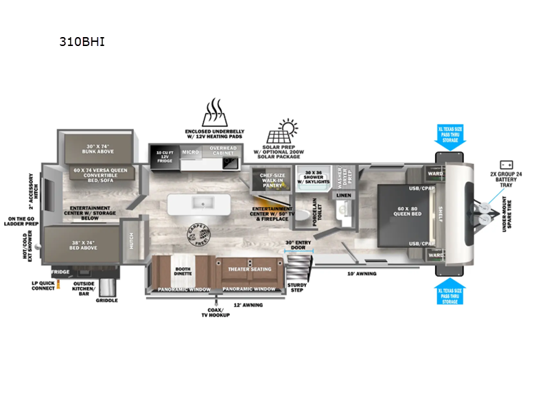 Step inside to discover a spacious and thoughtfully designed interior that can comfortably accommodate your family and guests. The Wildwood 310BHI boasts a well-appointed living area, complete with plush seating and a state-of-the-art entertainment system, ensuring relaxation and enjoyment on the road. The fully equipped kitchen features modern appliances, ample counter space, and abundant storage, making meal preparation a breeze. The elegant dining area provides a welcoming space for shared meals and conversations, enhancing the overall travel experience.