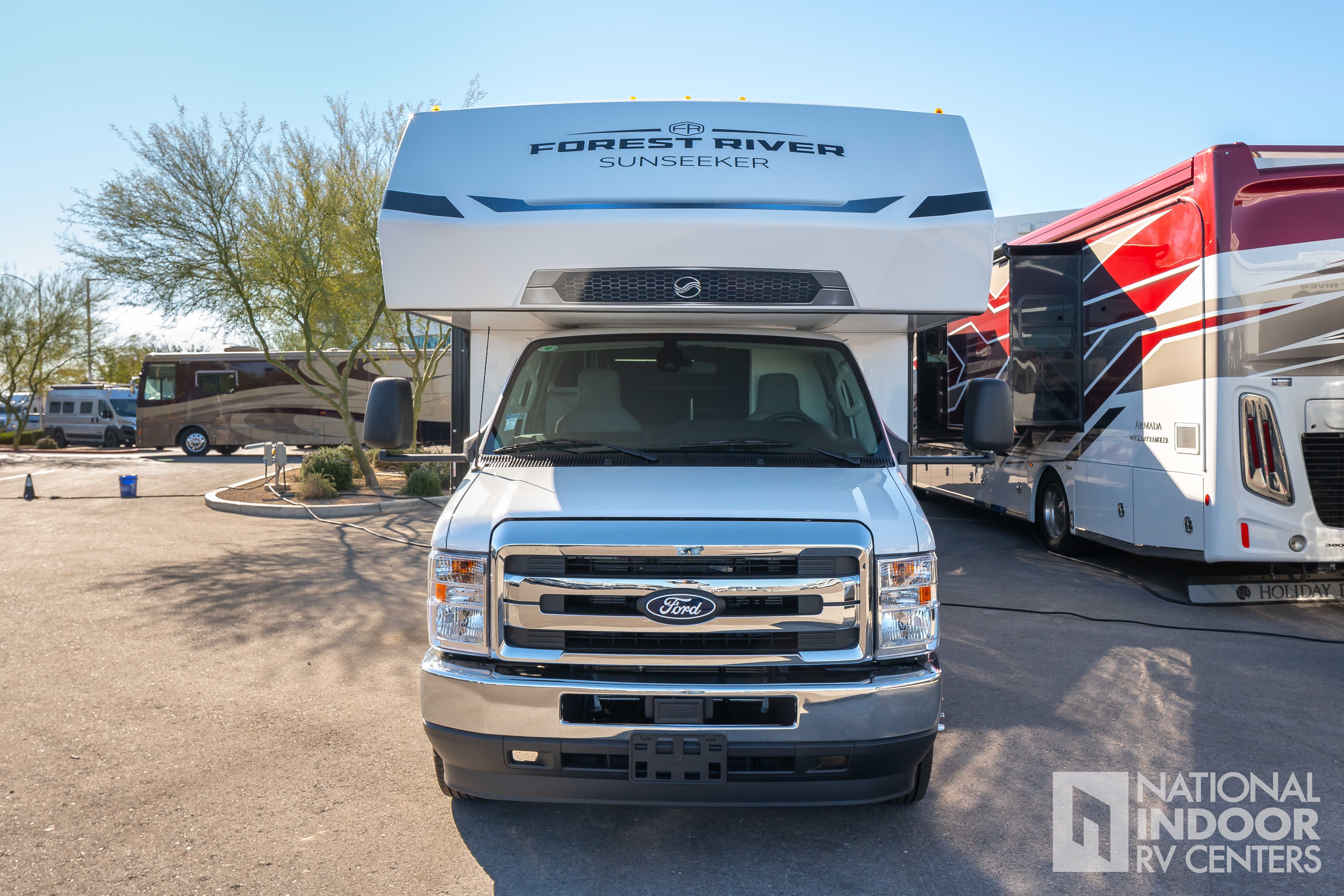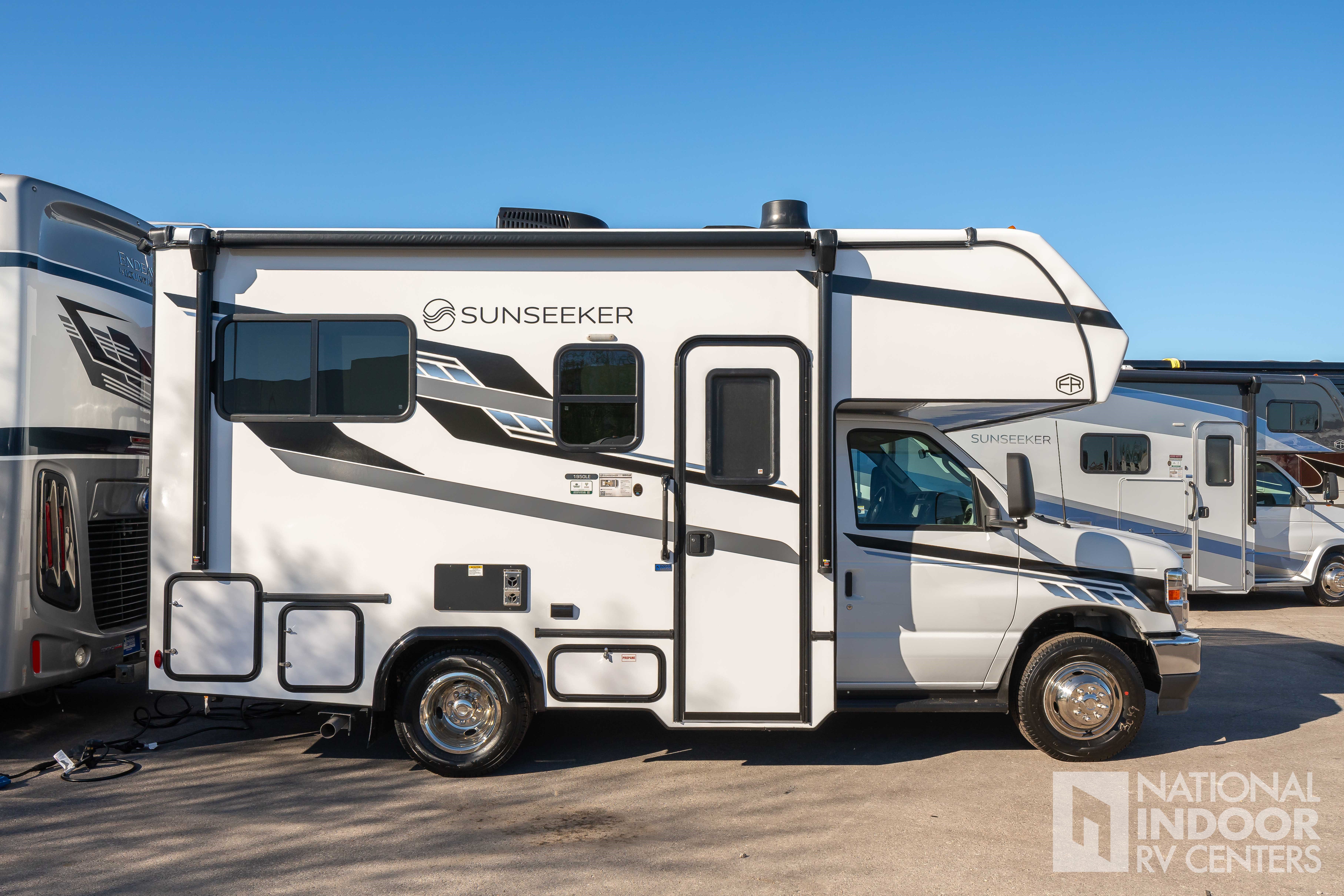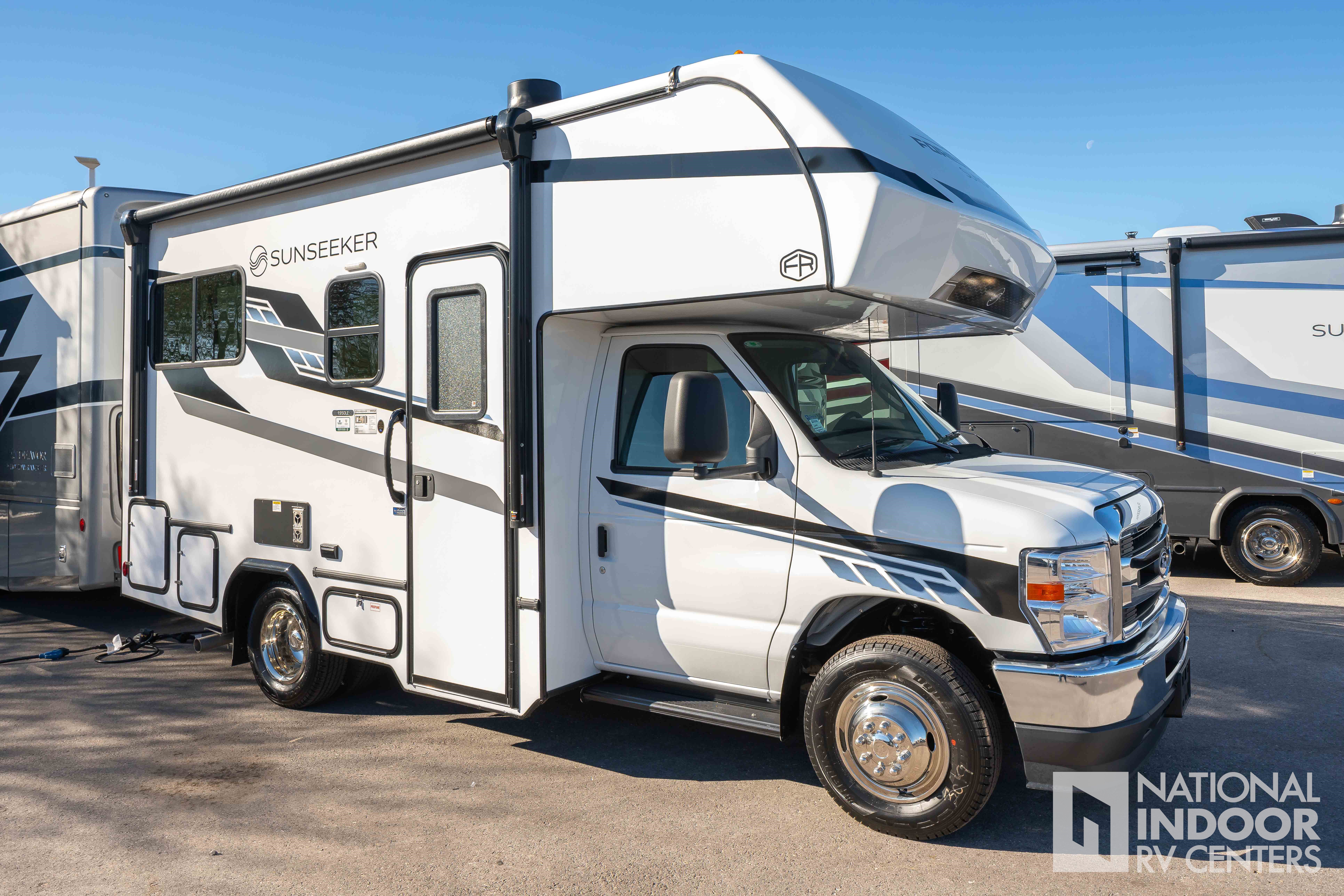 Step inside to find a thoughtfully designed interior that maximizes space and functionality. The Sunseeker LE features a cozy sleeping area, a fully equipped kitchen with a refrigerator, microwave, and two-burner stove, and a compact bathroom complete with a shower. The living area is enhanced by a comfortable dinette that easily converts into an additional sleeping space, accommodating up to four people. With ample storage throughout, including overhead cabinets and wardrobe space, you can bring along all your essentials for extended trips.