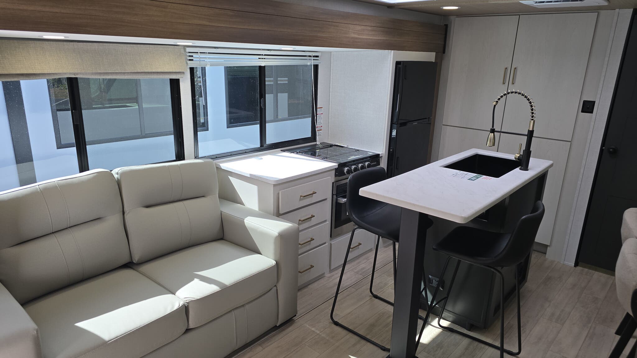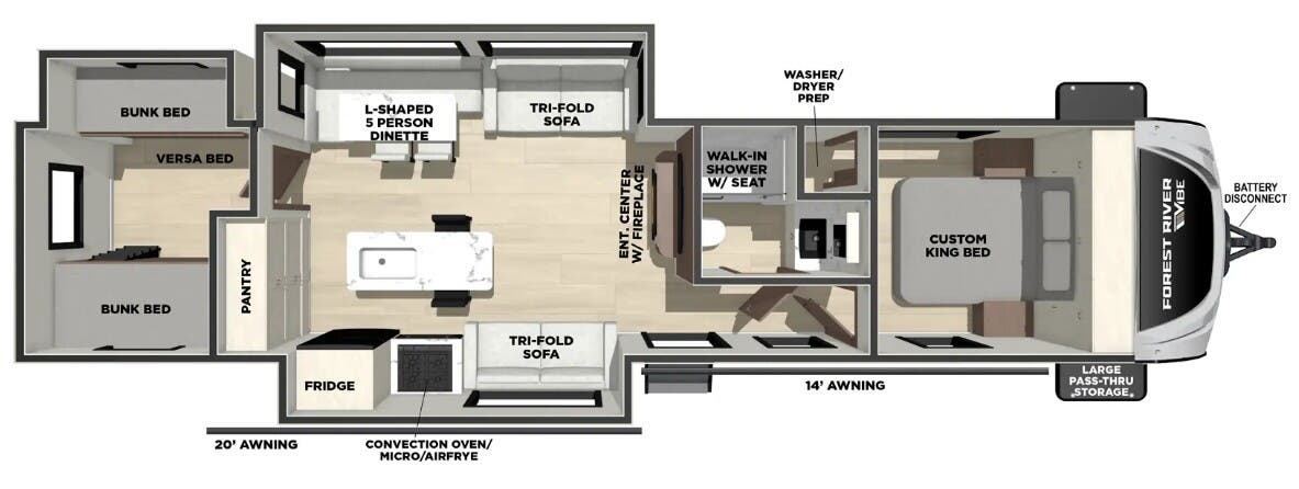Inside, the Vibe 3400BH is a marvel of modern design and functionality. It comfortably sleeps up to 11 people, making it ideal for family vacations, group outings, or extended road trips. The intelligently designed floor plan includes a master bedroom, bunkhouse, and convertible sleeping areas, ensuring everyone has a cozy place to rest. The kitchen is fully equipped with state-of-the-art appliances, allowing you to prepare meals with ease, while the spacious living area provides a perfect spot for entertainment and relaxation.