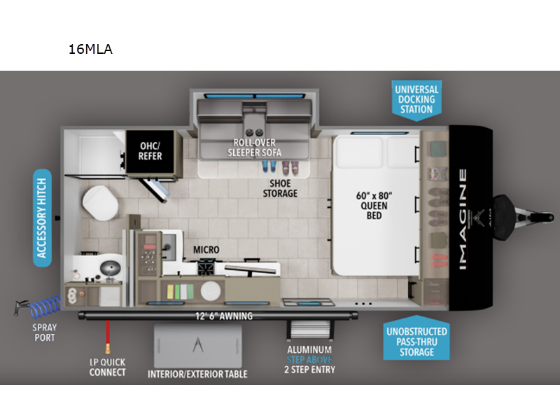 The Imagine AIM 16MLA features a single slide-out, which significantly enhances the living space, providing ample room for relaxation and entertainment. Despite its compact size, this travel trailer can comfortably sleep up to four people, making it perfect for small families or couples seeking adventure. The intelligently designed interior maximizes space and utility, offering a cozy atmosphere with modern amenities to ensure a comfortable stay wherever your journey takes you.