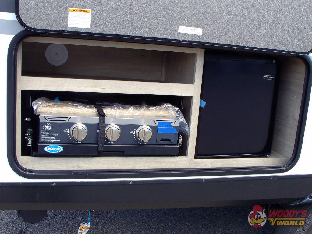 Step inside to find a thoughtfully designed interior that maximizes space and functionality. The 21MBE features a versatile Murphy bed that effortlessly transforms the living area into a cozy sleeping space, accommodating up to four people. The fully equipped kitchen boasts a three-burner stove, a microwave, and a refrigerator, all seamlessly integrated into a modern layout. Enjoy meals at the dinette, which also converts into an additional sleeping area. The bathroom offers a spacious shower and ample storage, ensuring you have everything you need for a comfortable journey.