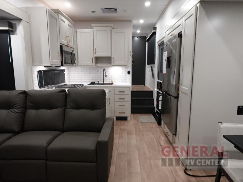 This fifth wheel can comfortably sleep up to seven people, making it ideal for family trips or group outings. The intelligently designed interior includes a spacious master bedroom, cozy bunk beds, and a convertible sofa, ensuring everyone has a comfortable place to rest. The modern kitchen is equipped with high-end appliances and plenty of storage, allowing you to prepare meals with ease. The stylish living area features a large entertainment center, perfect for unwinding after a day of exploration.