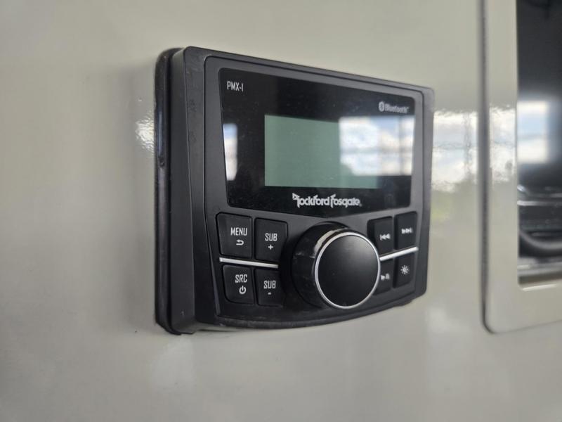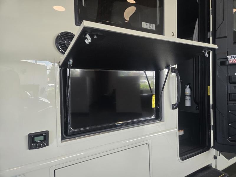 Step inside to discover a thoughtfully designed interior that maximizes space and comfort. The living area features plush seating and a state-of-the-art entertainment system, perfect for relaxing after a day of exploration. The kitchen is equipped with modern appliances, including a full-sized refrigerator, microwave, and a three-burner stove, making meal preparation a breeze. The dining area comfortably seats four, ensuring you can enjoy meals with family or friends.