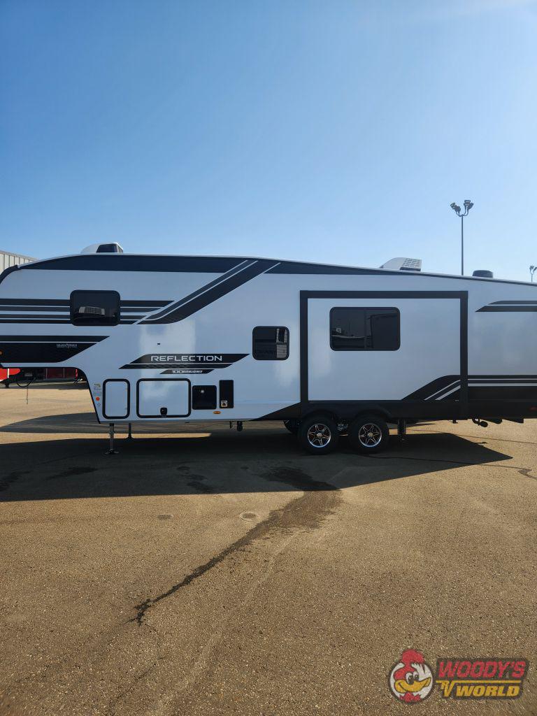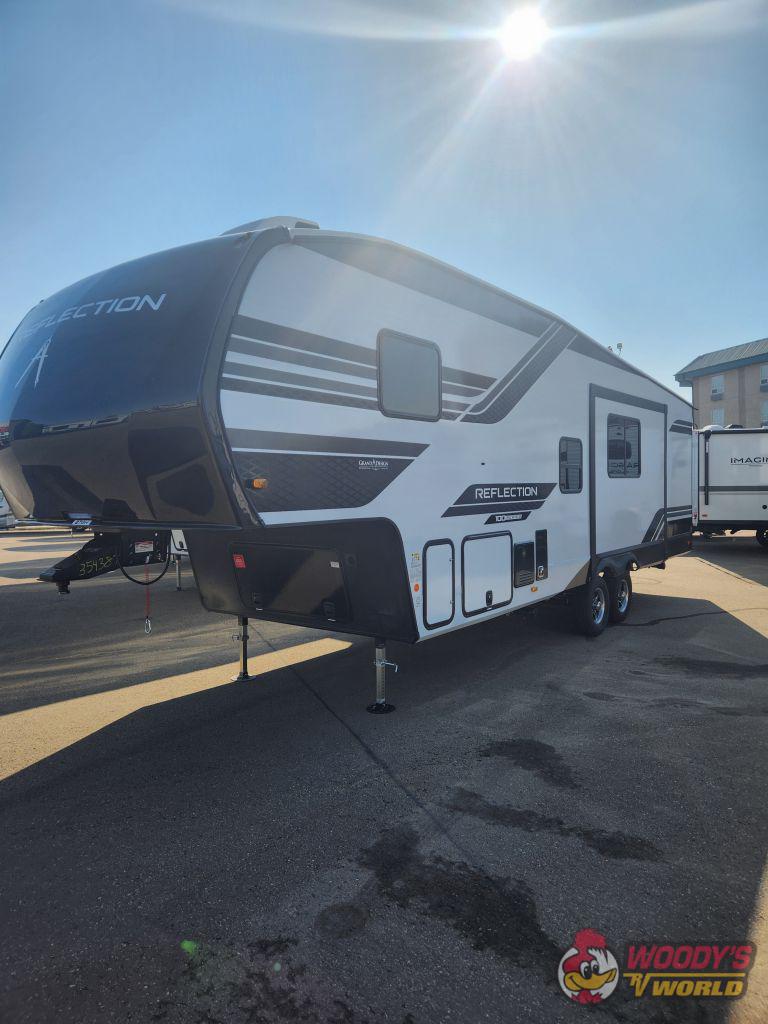 Step inside to discover a thoughtfully appointed living space, featuring high-quality furnishings and state-of-the-art amenities. The Reflection 100 27BH boasts a well-equipped kitchen with modern appliances, including a refrigerator, microwave, and stove, all seamlessly integrated into a stylish layout. The dining area comfortably accommodates family and friends, while the cozy living area is perfect for relaxation, complete with plush seating and entertainment options. The RV's sleeping quarters include a master bedroom with a queen-sized bed and a bunkhouse, providing ample space for up to eight occupants.