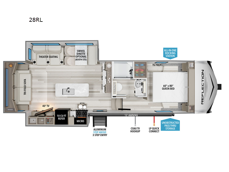 The Reflection 28RL features two expansive slide-outs, significantly enhancing the living area and providing a spacious environment that can comfortably accommodate up to four guests. The interior is thoughtfully designed, boasting high-quality finishes and modern amenities that ensure a home-like feel wherever your travels take you. The well-appointed kitchen, complete with state-of-the-art appliances, allows for effortless meal preparation, while the cozy living area is perfect for unwinding after a day of exploration.