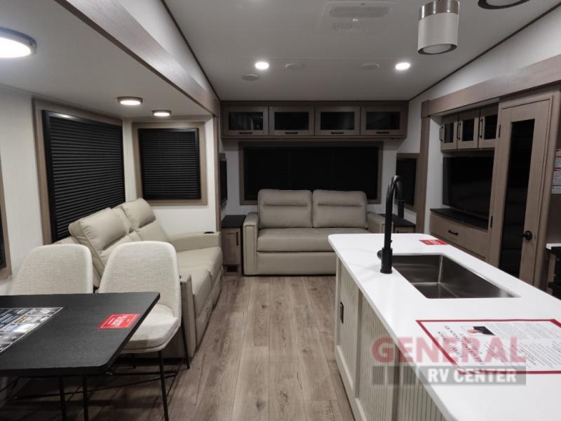 Weighing in at approximately 5,159 kilograms, this fifth wheel is engineered for stability and ease of towing, ensuring a smooth journey to your destination. The interior is thoughtfully designed with high-quality finishes and modern amenities, providing a home-like atmosphere wherever you go. The spacious living area features plush seating and a state-of-the-art entertainment system, perfect for unwinding after a day of adventure. The kitchen is equipped with top-of-the-line appliances, offering all the conveniences needed to prepare meals with ease.