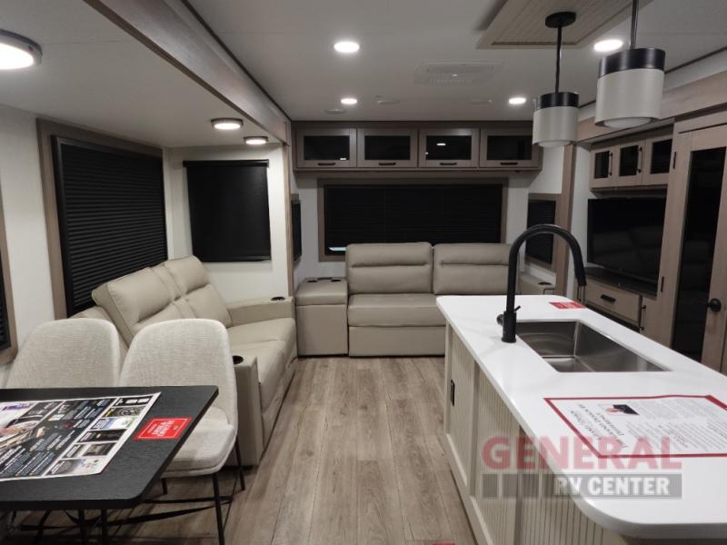 The Reflection 345RLTS is thoughtfully designed to accommodate up to five people, making it perfect for families or small groups of friends. The intelligently designed floor plan maximizes space and functionality, featuring a cozy sleeping area, a fully equipped kitchen, and a comfortable living area. The high-quality furnishings and modern amenities create a home-like atmosphere, ensuring that every journey is as enjoyable as the destination. With a weight of approximately 4,714 kilograms, this travel trailer is engineered for stability and ease of towing, allowing you to explore with confidence.