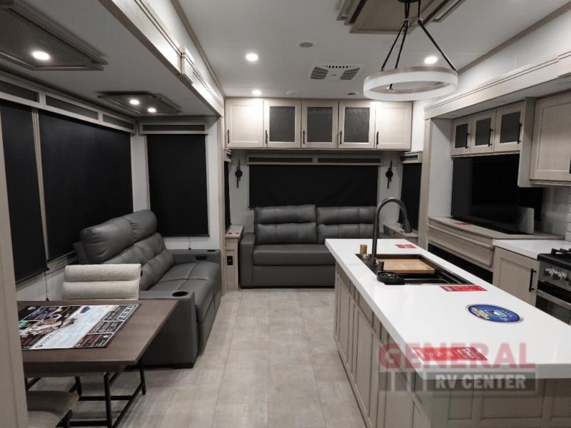 The Grand Design Solitude 370DV features three slide-outs, significantly enhancing the living space and ensuring a comfortable environment for all occupants. This model is thoughtfully designed to accommodate up to four people, making it perfect for families or couples who appreciate the finer things in life. The interior is adorned with high-quality finishes and modern amenities, ensuring that every journey is as comfortable as it is memorable. From the fully equipped kitchen to the luxurious sleeping quarters, every detail is tailored to meet the highest standards of comfort and convenience.