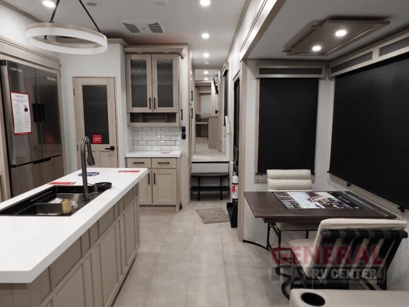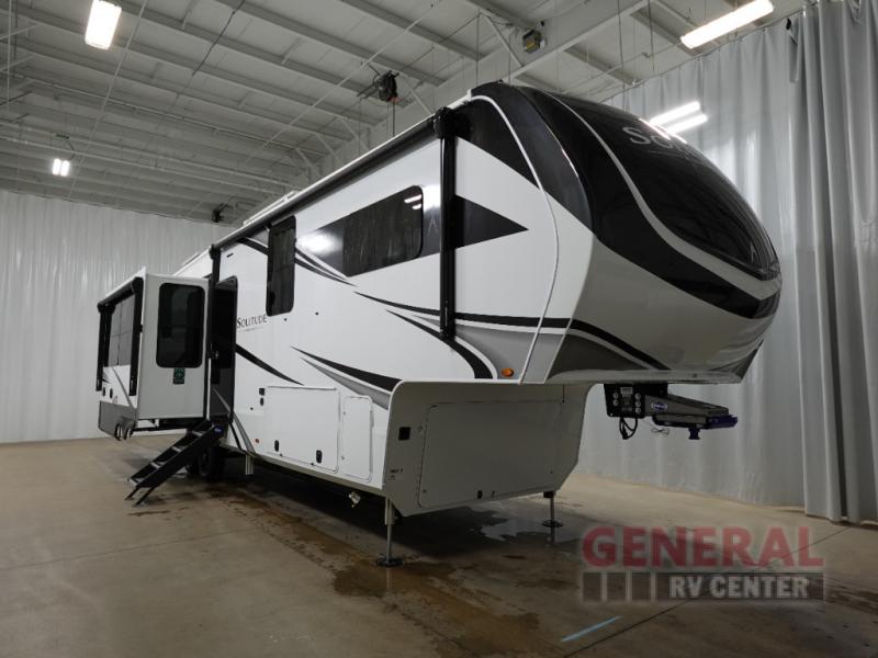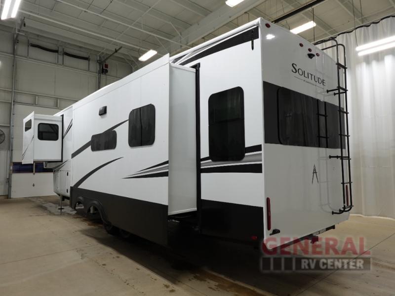The Solitude 370DV features three expansive slide-outs, enhancing the interior space to create a home-like atmosphere. Accommodating up to four people, this RV is perfect for small families or couples seeking a luxurious escape. The thoughtfully designed floor plan includes a master suite with a plush queen-sized bed and a convertible sofa bed in the living area, ensuring restful nights after a day of exploration. The interior is adorned with high-quality finishes and modern amenities, including a fully equipped kitchen with stainless steel appliances and a spacious bathroom with a large shower.