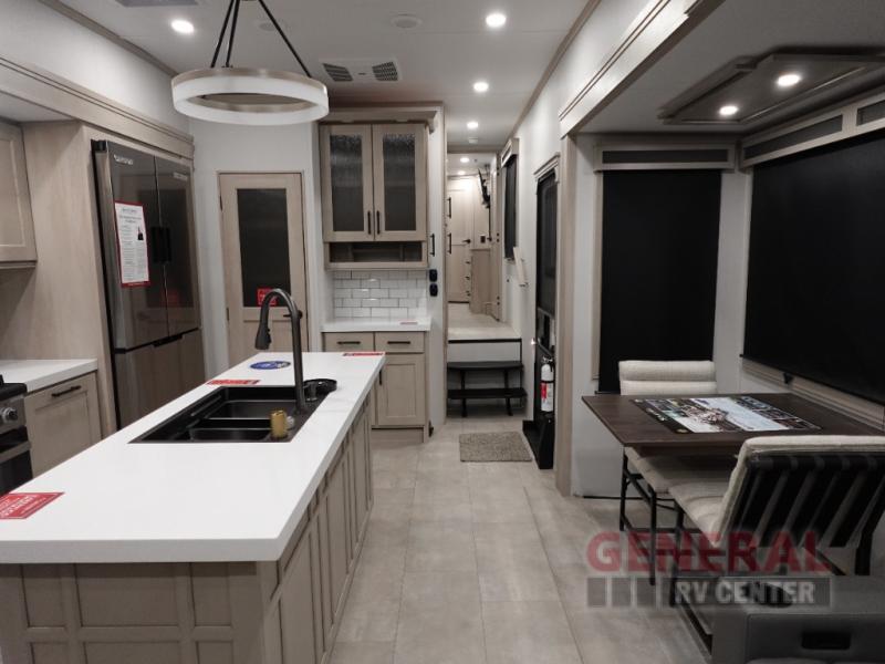 Step inside, and you'll immediately notice the generous living space, thanks to its three slide-outs. These nifty extensions create a roomy interior that feels more like a cozy apartment than an RV. Whether you're lounging on the plush seating or whipping up a meal in the well-equipped kitchen, you'll appreciate the thoughtful layout and modern amenities. The Solitude 370DV comfortably sleeps four, making it perfect for family getaways or trips with friends. Imagine nights spent under the stars, knowing you have a comfy bed waiting for you inside.