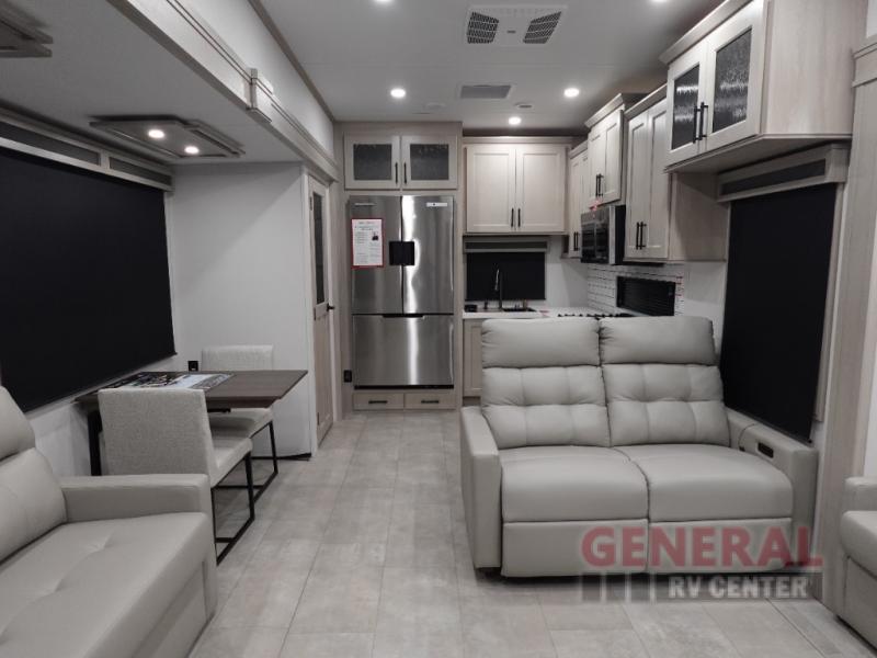 Step inside and you'll find four slide-outs that create an incredibly roomy interior, making it feel more like a luxury apartment than an RV. The Solitude 417KB comfortably sleeps six, so whether you're traveling with family or friends, everyone will have their own cozy space. The master suite is a dream come true, featuring a plush bed and ample storage. The kitchen is fully equipped with modern appliances, perfect for whipping up a gourmet meal on the road. And don't forget the spacious living area, where you can kick back and enjoy a movie night or simply soak in the views from the large windows.