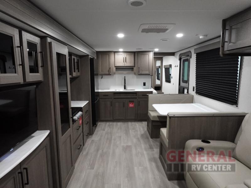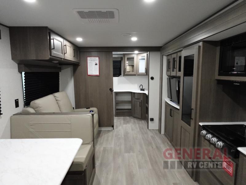 Step inside to find a welcoming interior that can comfortably sleep up to five people. The cleverly designed slide-out expands your living space, providing ample room for relaxation and entertainment. Whether you're enjoying a meal at the dinette or unwinding on the cozy seating, you'll appreciate the attention to detail and quality craftsmanship throughout. The kitchen is fully equipped with modern appliances, making it easy to whip up your favorite meals on the go.