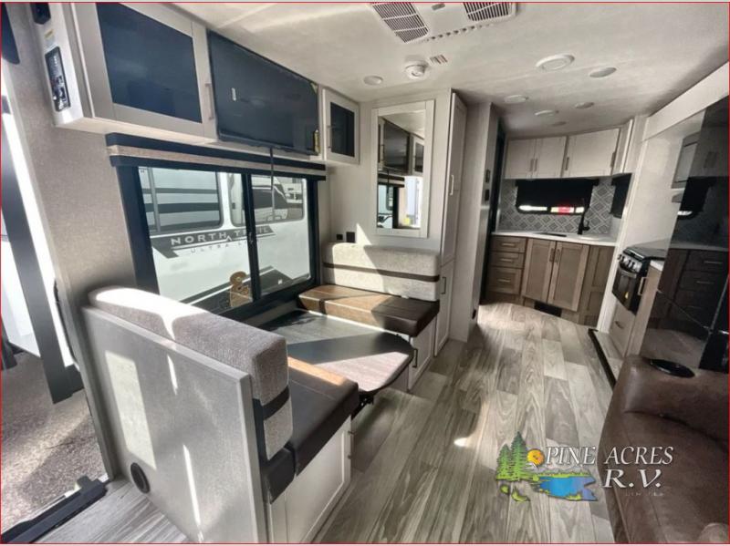 Step inside to find a thoughtfully designed interior that maximizes space and functionality. The North Trail 210MB features a luxurious queen-sized Murphy bed that effortlessly transforms your living area into a cozy bedroom, offering the perfect blend of style and practicality. The fully-equipped kitchen boasts modern appliances, including a refrigerator, microwave, and three-burner stove, all set within elegant cabinetry. With ample storage space and a generous dining area, this travel trailer ensures that every meal is a delightful experience. The bathroom is equally impressive, featuring a spacious shower and all the amenities you need to freshen up after a day of adventure.