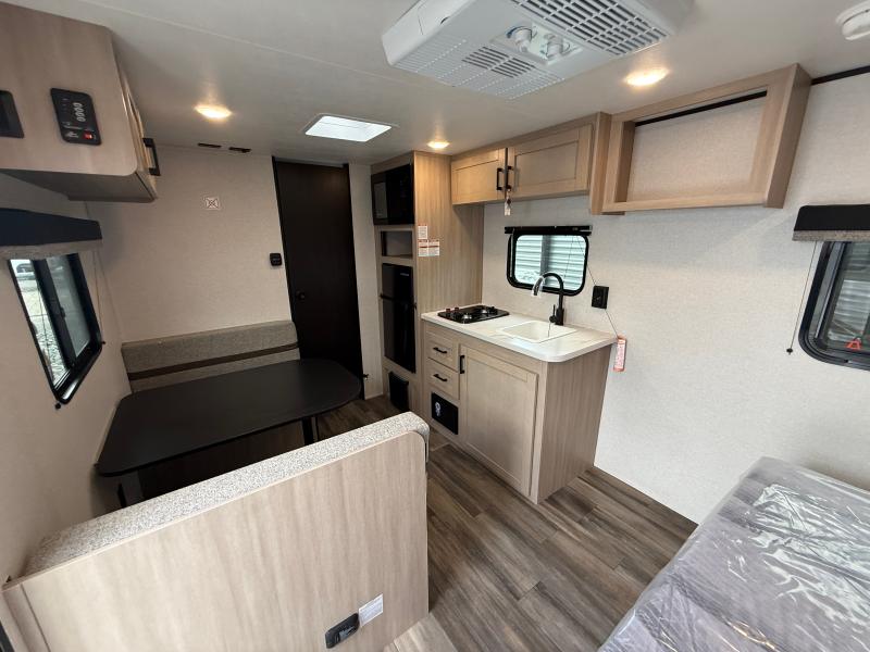 Inside, you'll find a cozy setup that maximizes every inch of space. The 17QB features a comfortable sleeping area, a fully-equipped kitchenette with all the essentials, and a snug dining nook that converts into extra sleeping space. Whether you're whipping up a quick meal or settling in for a movie night, this travel trailer has got you covered. Plus, with plenty of storage options, you can bring along all your favorite gear and gadgets.