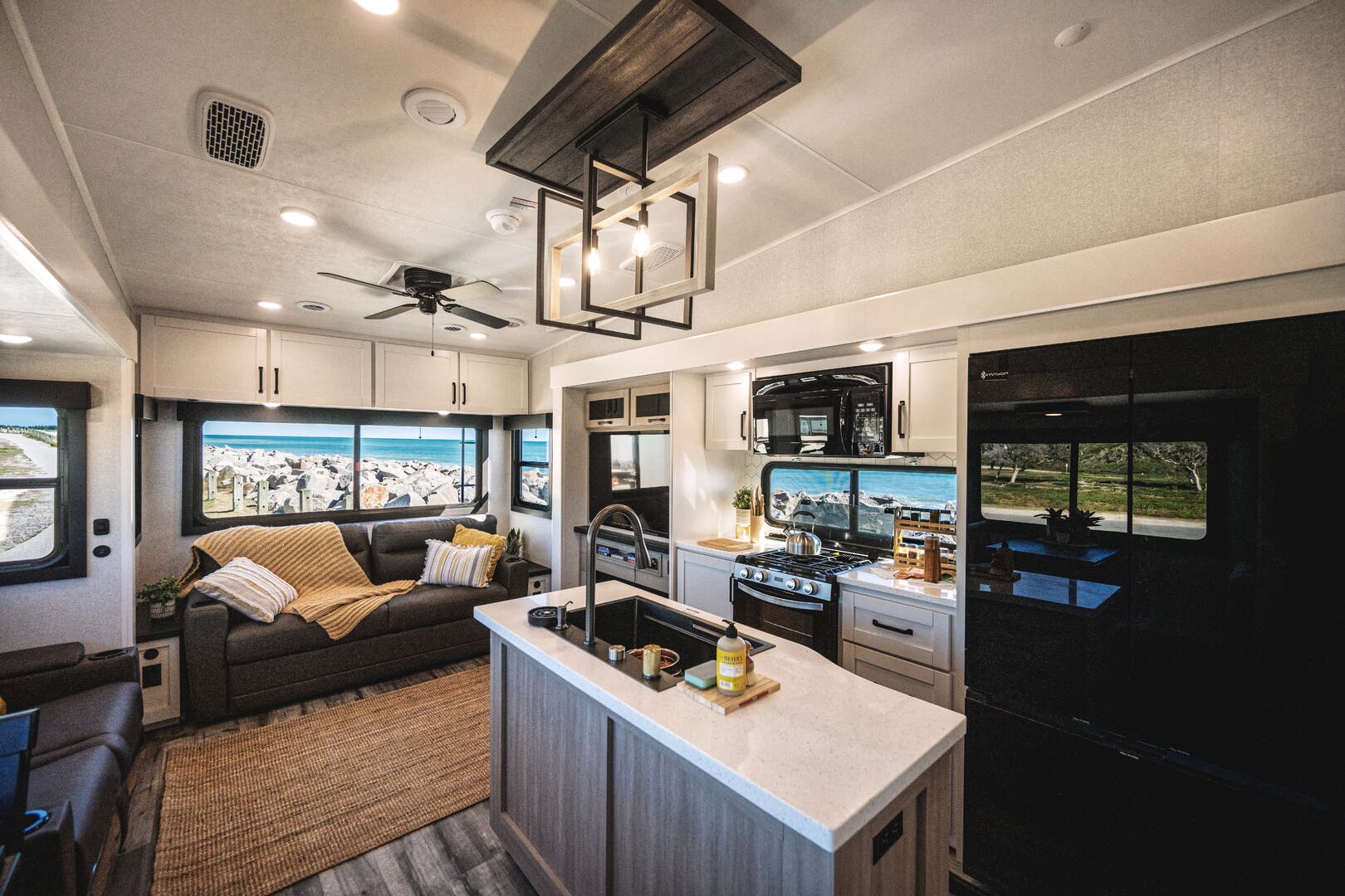 The Roamer 35MRQS features four slide-outs, expanding the living area to create a roomy and inviting atmosphere. With the ability to sleep up to eight people, this fifth wheel is perfect for families or groups seeking adventure without sacrificing comfort. The intelligently designed floor plan includes a master suite, bunkhouse, and convertible sleeping areas, providing privacy and flexibility for all occupants. The high-quality finishes and modern amenities make this RV a true home away from home.