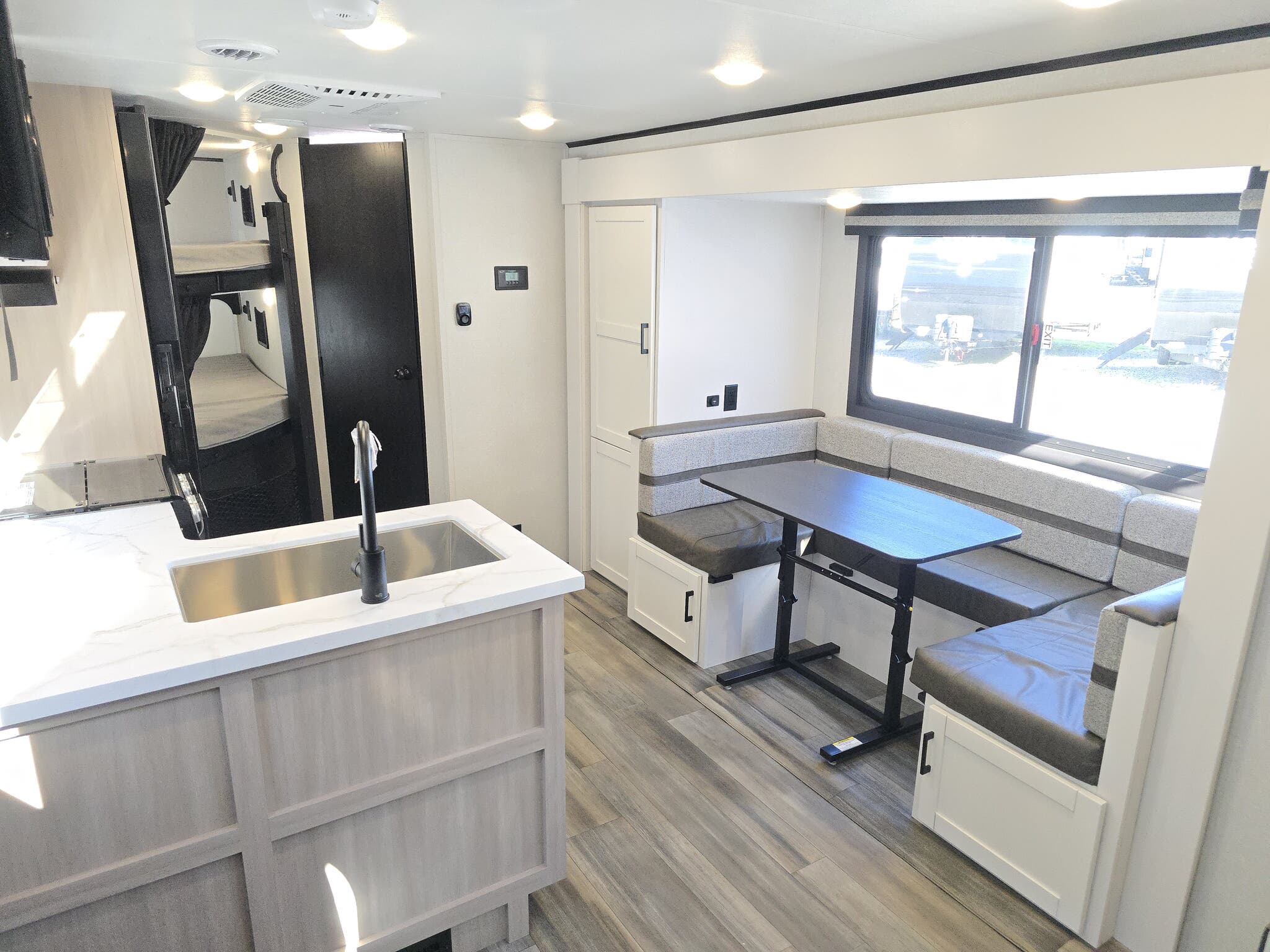 Measuring approximately 22 feet in length, the Range Lite 220DBM is compact enough for easy maneuverability yet spacious enough to accommodate up to eight sleepers comfortably. Whether you're embarking on a weekend getaway or an extended road trip, this travel trailer provides the perfect blend of convenience and luxury. The intelligently designed interior features a modern kitchen, cozy sleeping quarters, and a versatile dining area, ensuring you have all the comforts of home wherever you roam.
