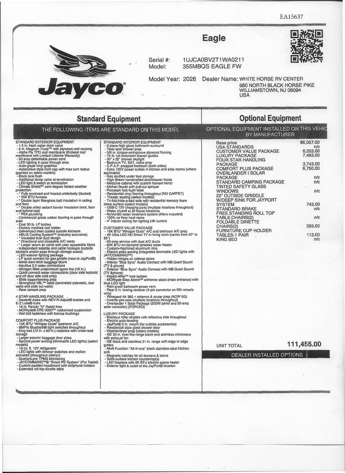 Weighing approximately 6,901 kilograms, this fifth wheel is built with durability and safety in mind. The robust construction and advanced suspension system ensure a smooth and stable ride, even on the most challenging terrains. With its impressive features and thoughtful design, the 2026 Jayco Eagle 355MBQS Fifth Wheel is not just an RV; it's a gateway to unforgettable adventures and cherished memories. Whether you're exploring the great outdoors or enjoying a peaceful retreat, this RV promises to deliver comfort, convenience, and a touch of elegance wherever your journey takes you.