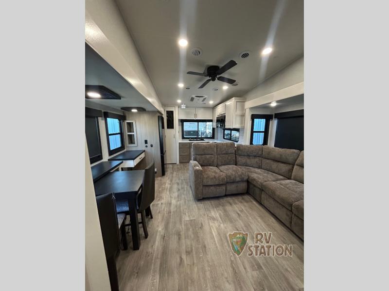 Inside, the Jayco Eagle 365UKTS can comfortably sleep up to four people, making it ideal for small families or couples seeking a luxurious getaway. The master bedroom features a plush queen-sized bed, while the living area offers a convertible sofa bed, ensuring restful nights for all. The kitchen is equipped with modern appliances, including a full-sized refrigerator, microwave, and oven, all seamlessly integrated into the elegant cabinetry. The dining area provides a cozy space for meals, with ample seating for everyone.
